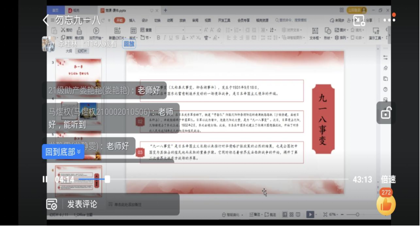 牢记历史,就是开创未来。为教育广大青年学生不忘国耻,珍爱和平,增强爱国主义意识,太阳成集团tyc33455cc于9月28日晚,通过线上钉钉开展了“勿忘九一八,吾辈当自强”主题党课活动。本次党课由太阳成集团tyc33455cc李桂林老师主讲,太阳成集团tyc33455cc部分党员教师及21级积极分子聆听了此次党课。