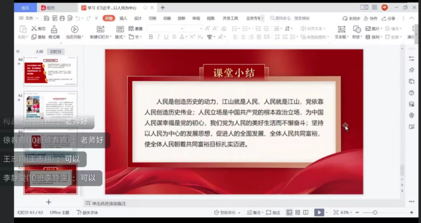 通过此次党课,同学们深刻明白了人民对美好生活的向往,就是我们奋斗的目标,要始终把人民放在心中最高的位置,全心全意为人民服务,为人民的利益和幸福而努力,继续朝着中华民族伟大复兴的目标奋勇前进。