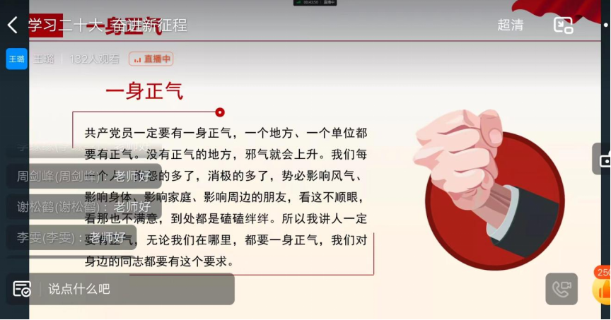 本次党课王璐老师向大家讲述了党过去的五年和新时代十年的伟大变革。告诫了我们要坚定不移听党话,跟党走,怀抱梦想又脚踏实地,敢想敢为又善作善成,同学们立志要做一个有理想,敢担当,能吃苦,肯奋斗的新时代好青年,为全面建设社会主义现代化国家,全面推进中华民族伟大复兴而团结奋斗!
