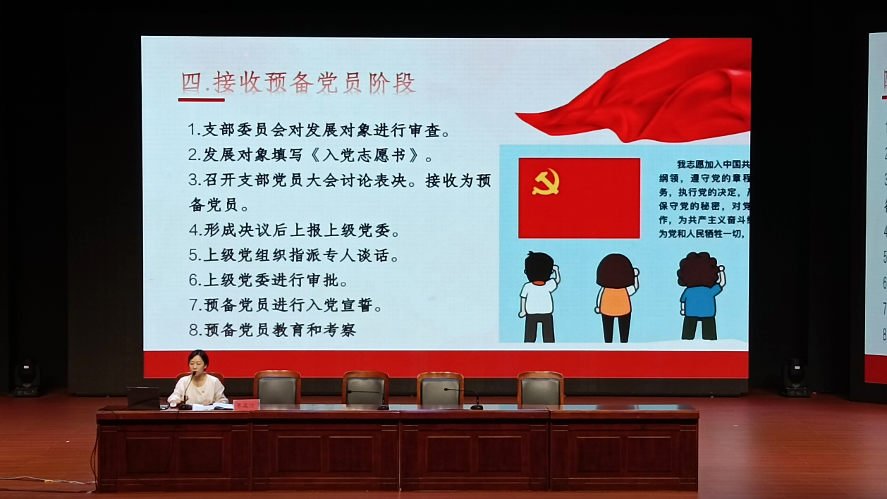 李鑫汝为新生带来大学生涯的第一堂党课,她为新生们讲解了党的性质、宗旨、基本原则等基本理论知识,详细梳理了学生党员发展的基本工作流程,说明了学生入党的基本要求,引导青年应把个人的理想追求融入党和国家事业之中,在大学时光中真正学有所成,为党和国家的事业奋斗,争做时代薪火的赓续者。