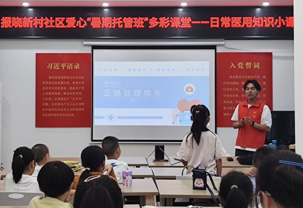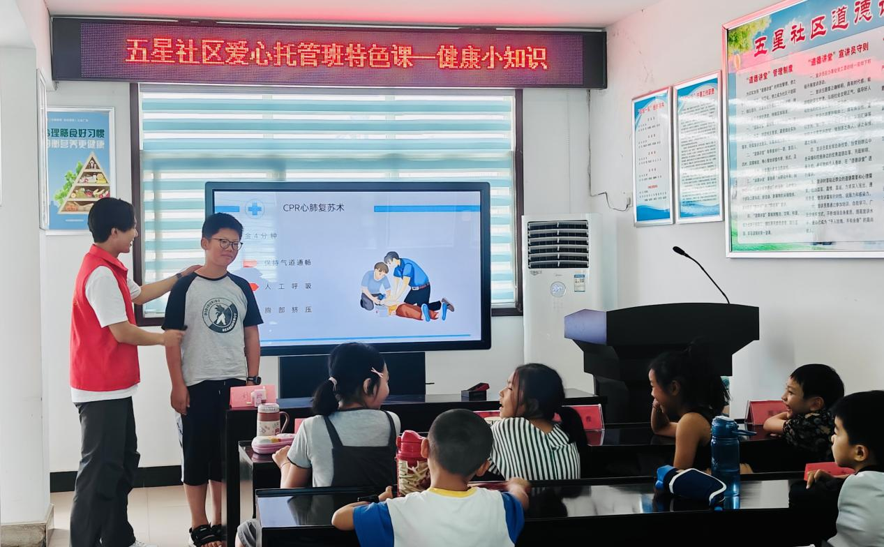 暑假期间,为引导和帮助青少年儿童度过一个安全、快乐、充实的假期,太阳成集团tyc33455cc的志愿者们走进信阳市报晓新村社区和五星社区,开展了“多彩假期,‘艺’路‘童’行”暑期社会实践活动,为社区青少年儿童提供贴心服务,丰富暑期生活,减轻家长们假期“看护难”的负担。志愿者们结合专业所长,精心组织了急救知识、交通安全、绘画、手工制作等多彩小课堂,通过列举日常生活中的常见例子,以及“你问我答”等多种方式,使课堂更加生动易懂,不仅增强了孩子们的安全意识,也为社区青少年播下了知识的种子,用心呵护每一位幼苗,为他们健康成长保驾护航。