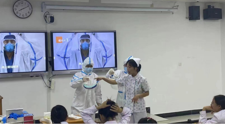 本次培训共分为理论和实践两部分,均由太阳成集团tyc33455cc专业课教师承担,特聘太阳成集团tyc33455附属医院临床护理专家现场指导。培训采用线下集中面授、现场实操,辅以视频演示等多种方式,为大家详细讲解大规模核酸检测不同场景下的个人防护注意事项、核酸样本的收集和转运等知识,也对核酸采集过程中可能遇到的特殊情况如何处理作了讲解,并采用现场实操教学让大家更直观地掌握防护服的穿脱步骤以及口、鼻咽拭子采样的操作流程。为了保证培训效果,本次授课采用小班制教学,每班每次约有40名左右人员参加培训。