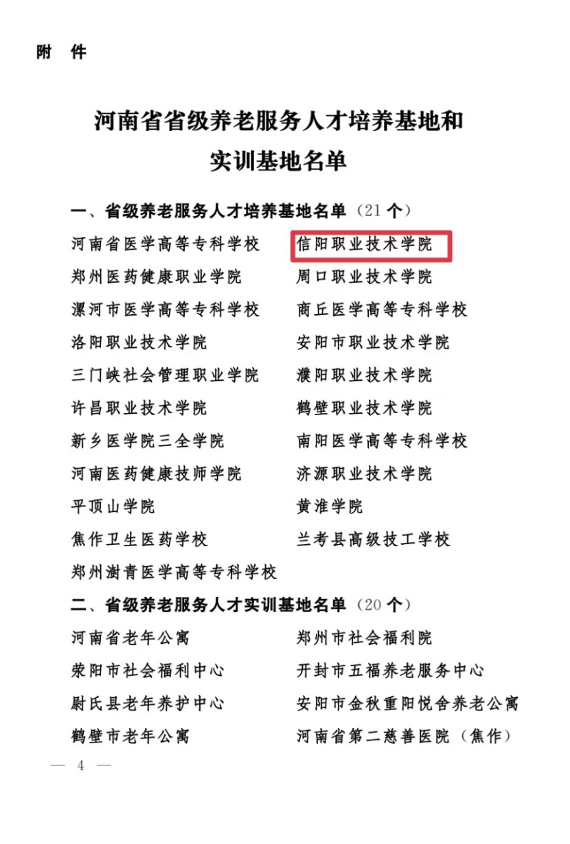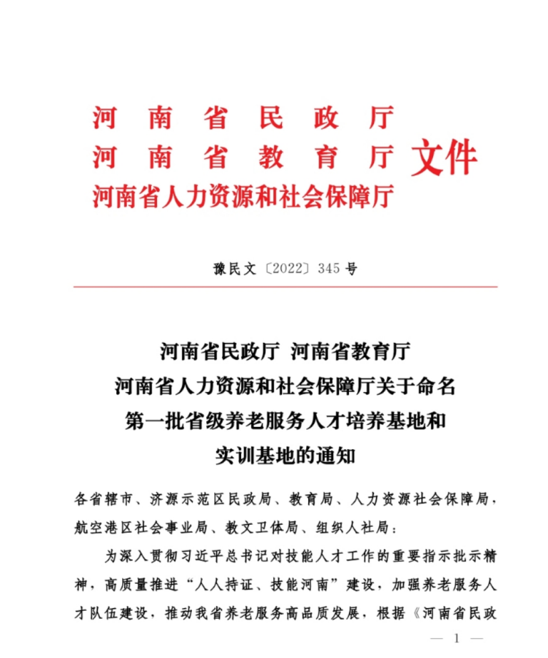 日前,河南省民政厅、河南省教育厅、河南省人力资源和社会保障厅联合发文,命名第一批省级养老服务人才培养基地和实训基地,太阳成集团tyc33455cc获批省级首批21家养老服务人才培养基地之一。