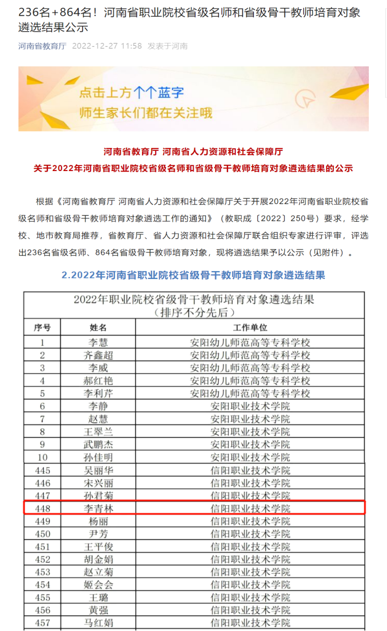 近日,河南省教育厅、河南省人力资源和社会保障厅发布《关于2022年河南省职业院校省级名师和省级骨干教师培育对象遴选结果的公示》,经教师个人申报、学校推荐、专家评审、网站公示,我院青年骨干教师李青林成功入选2022年河南省职业院校省级骨干教师培育对象。