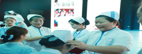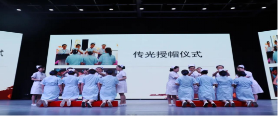 前辈为护理新生戴上圣洁的白色燕尾帽,护理新生接过前辈手中代表着传承奉献的红烛。闪烁的红光代表了护理新人将为护理事业奉献的决心。