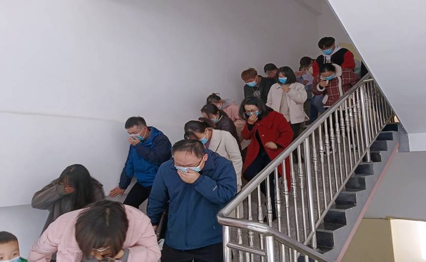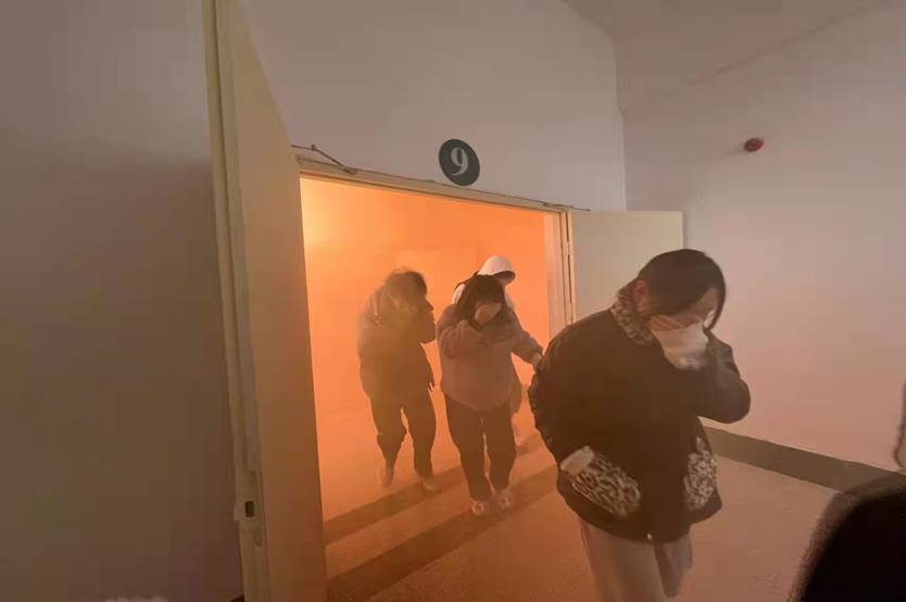 随着紧急集合的哨声响起,楼道中浓烟四起,同学们在老师的指挥下,用衣服捂着口鼻快速有序的从疏散口逃生,迅速统一的撤离到安全区域。