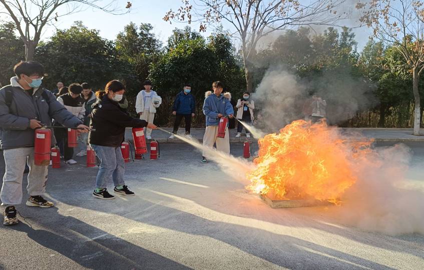 最后,消防队员通过现场灭火操作教学向大家仔细讲解了灭火器的使用方法和注意要点。参加活动的同学们积极参与,在专业人员的指导下,用灭火器完成了现场灭火操作。