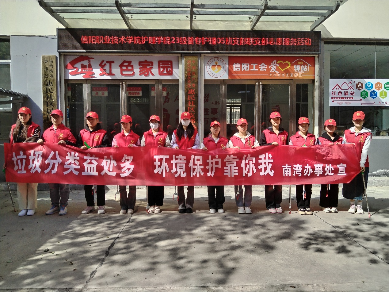 为提高学生环保意识,为师生营造一个温馨、干净、清洁的校园生活环境,23级护理02班团支部走进信职龙飞苑小区开展卫生清扫志愿活动。志愿者们秉承着认真负责的态度,开始打扫卫生,有的清理废品、有的清理树叶、有的捡拾白色垃圾,志愿者们分工明确、干劲十足。经过志愿者的辛勤劳动,小区环境变得更加清新美丽、整洁有序。
