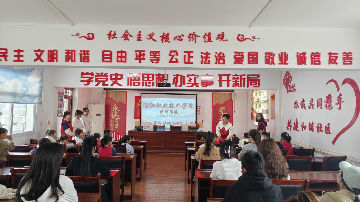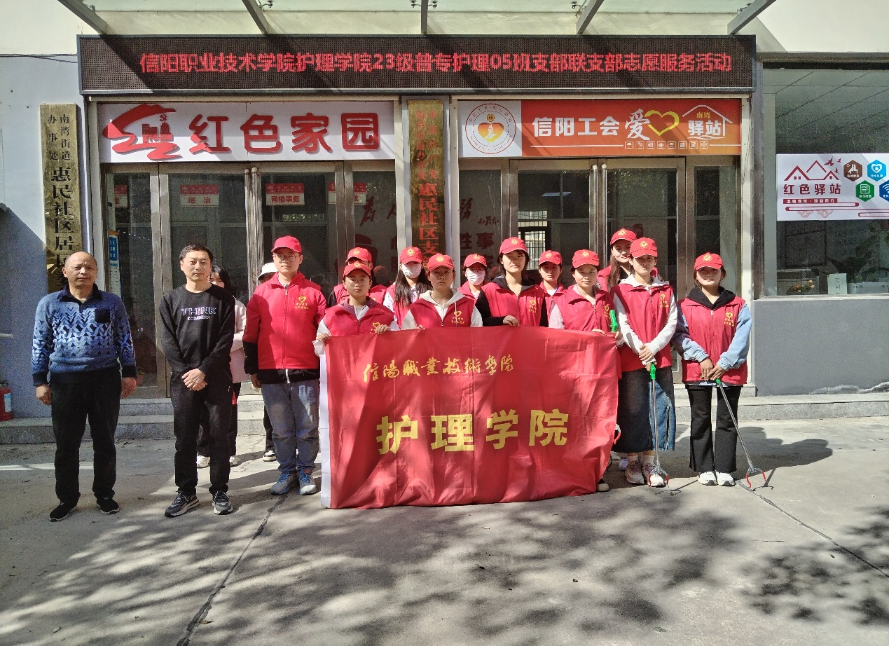23级护理03班团支部来到信阳市红太阳社区开展了“义诊进社区,健康有‘医’靠”志愿服务活动,活动中同学们不仅为社区居民进行健康护理、科普宣传等,而且在活动结束后来到张忠良、李传章等老党员的家里慰问、交流、打扫卫生,获得社区居民的一致好评。