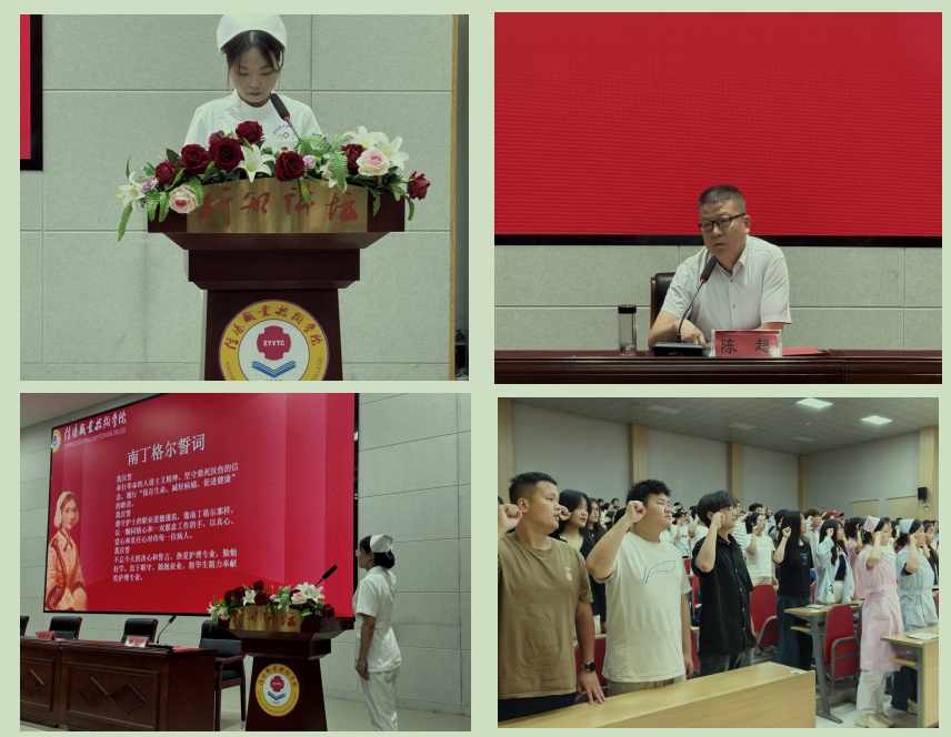 作为实习新生力量,2023 级实习生代表宋莹冰同学庄严承诺:“我们将以‘空杯心态 ’投入学习,用专业素养守护健康,用温暖关怀抚慰病痛 ”,其发言中 “让我们以此实习为起点,用行动证明:我们定会成为有温度、有技术、有担当 的护理人 ”,引发了全场共鸣。